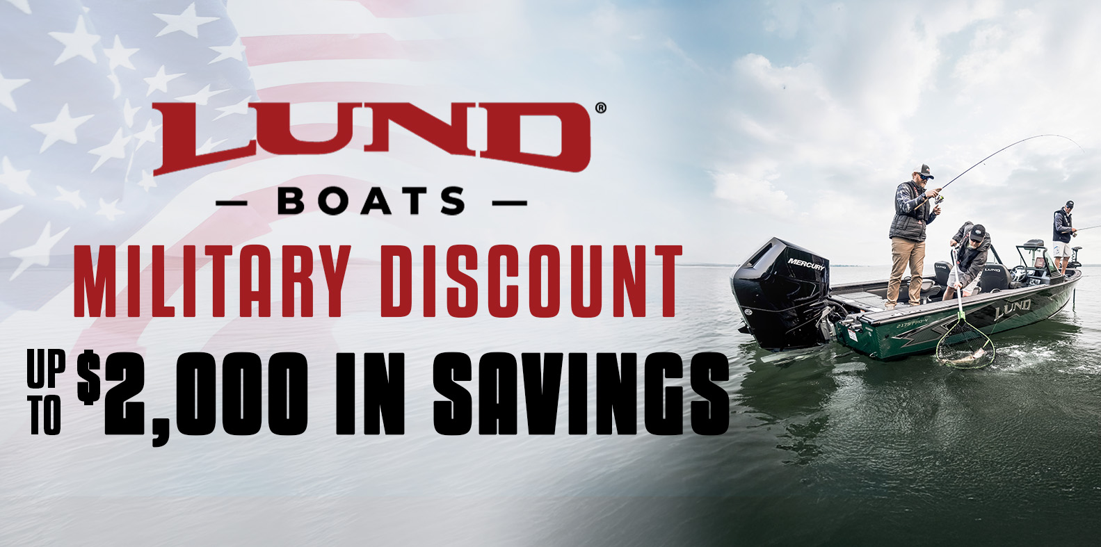 *Limited Time Offer available only at participating dealers in the U.S. and Canada. Savings cannot be used as a down payment. Promotional savings can be combined with ONE of the following: Lund Military Discount, Student Angler Discount, or Everyday Hero Discount. Available on select models. See participating dealer for details.
