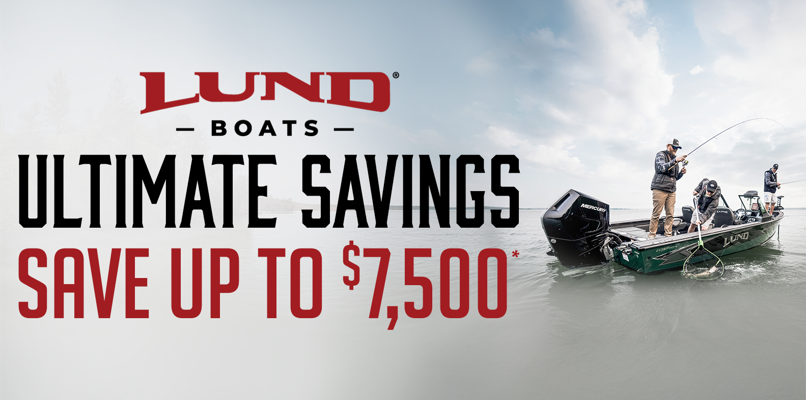 *Offer good through January 31, 2026, and available only at participating dealers in the U.S. and Canada. Savings shown in U.S. Dollars and cannot be used as a down payment. Ultimate Savings can ONLY be combined with ONE of these existing Lund discounts: Military OR Everyday Hero (first responder) OR Student Angler OR Brunswick Friends & Family. Offer excludes WC, SSV, limited-edition Heritage Fury, Limited-Edition Rebel XL and Jon boats. See participating dealer for details. OFFER VOID WHERE RESTRICTED OR OTHERWISE PROHIBITED BY LAW.