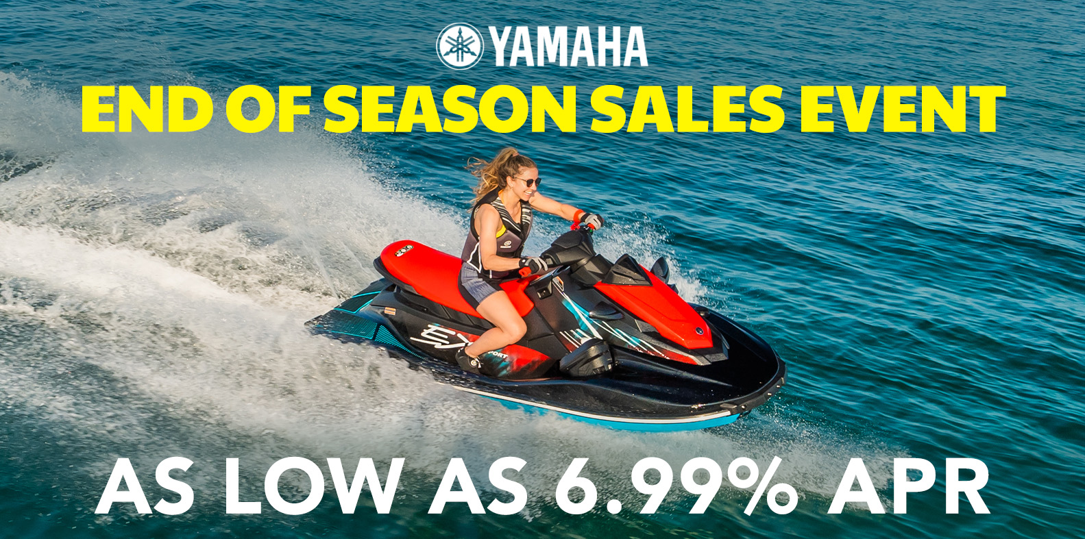 *Offer available on approved purchases of new (unused and not previously warranty registered) 2019 – 2026 Yamaha WaveRunners made on the Yamaha Credit Card issued by WebBank. Offer valid 10/1/2025 – 12/31/2025. Account must be open and current to be eligible for this offer. Introductory 6.99%, 7.99%, 10.99%, 15.99% APR financing with minimum payments of 1.58%, 1.67%, 1.92%, 2.33% of the purchase price balance are effective for initial 24 months based on creditworthiness. After the 24-month introductory period, standard APR 15.99%, 18.99%, 20.99%, 23.99% based on creditworthiness, with minimum monthly payments shall be due equal to the greater of 1% of existing balance plus standard interest charges, late fees and late payment amounts, or $25 until the purchase price is paid in full. Minimum interest charge $2 per month. Promotional rates are based on creditworthiness. Not all applicants will qualify.